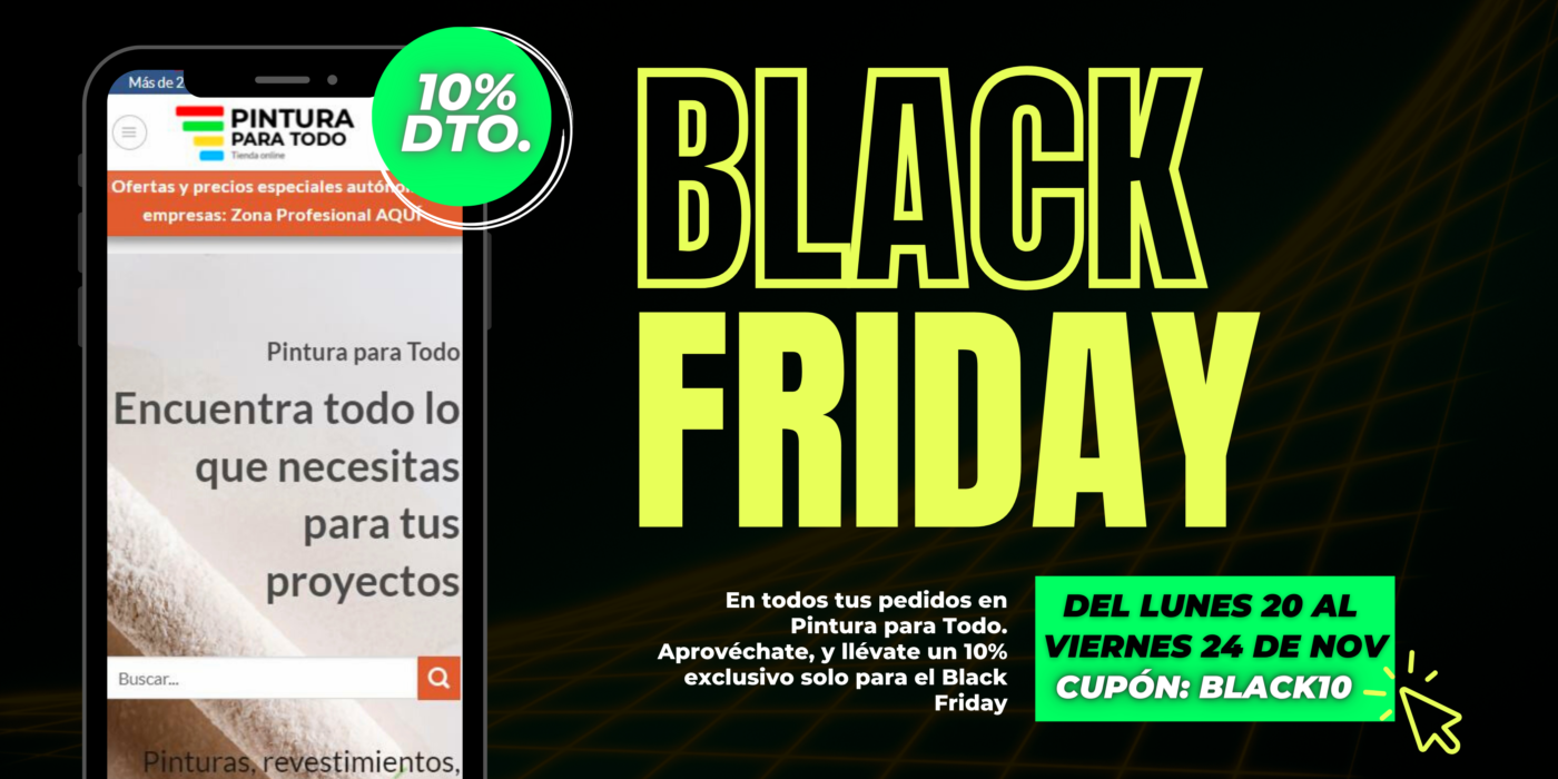 Llega el Black Friday a Pintura para Todo. Del lunes 20 al viernes 24 de Noviembre, tendrás un 10% en toda la web, con el cupón BLACK10. No dejes pasar esta oportunidad llevándote unos productos de primera calidad de una marca para profesionales de primera.